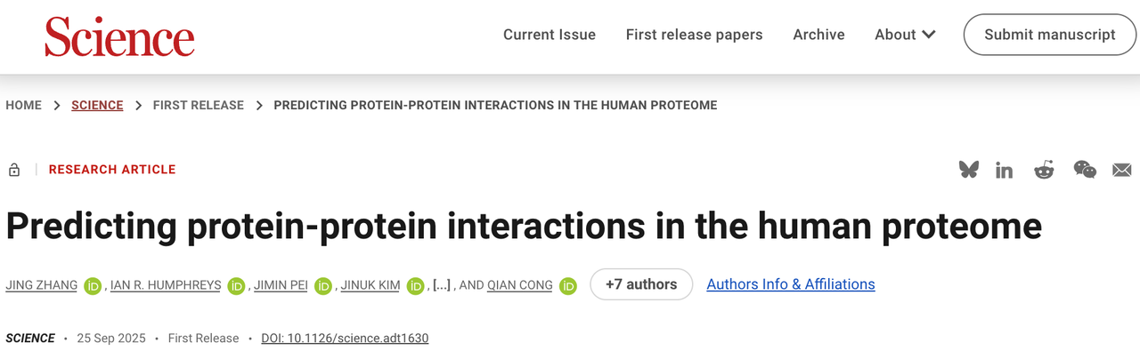 “Predicting protein-protein interactions in the human proteome”(Zhang et al., Science 2025, DOI: 10.1126/science.adt1630)