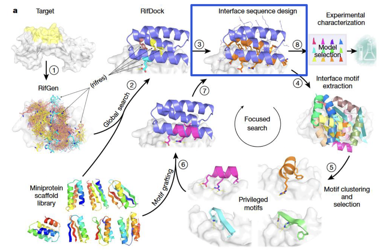 接下来,研究者使用 PatchDock 和 RifDock 这两种分子对接工具,把骨架尝试性地“放置”到目标蛋白的结合表位上。