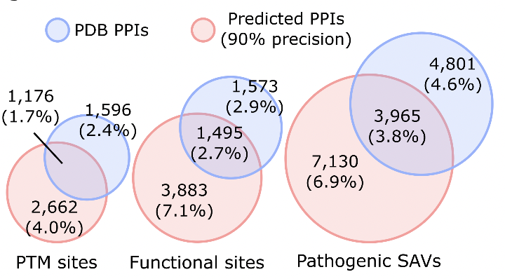 疾病相关性强:作者将已知致病突变映射到预测互作界面,发现约 16,000个突变落在这些位置,说明PPI破坏可能是致病的重要机制。