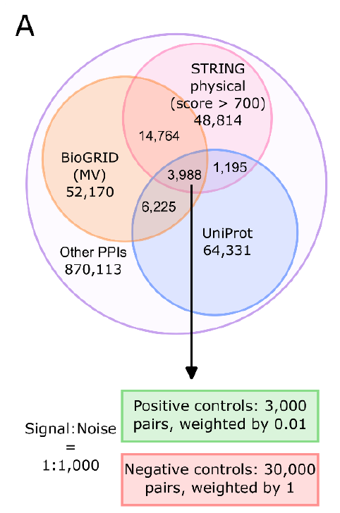 一个直观的例子就是文章中的 图1A:研究团队对比了三大主流数据库(UniProt、BioGRID、STRING)的“高置信度”互作数据,结果发现三者的交集仅有3988对。这意味着,即便是我们最“可信”的实验结果,不同数据库之间的重合度也极低,显示出目前人类互作图谱的碎片化和不一致性。