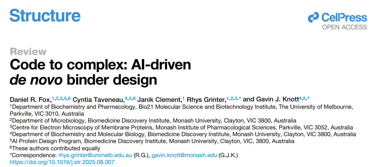 今天看到一篇刚在Cell旗下的Structure杂志上online的综述文章《Code to Complex: AI-driven de novo binder design》 ,感觉写的非常好,可以看作是一本蛋白质设计入门级的“导航图”。