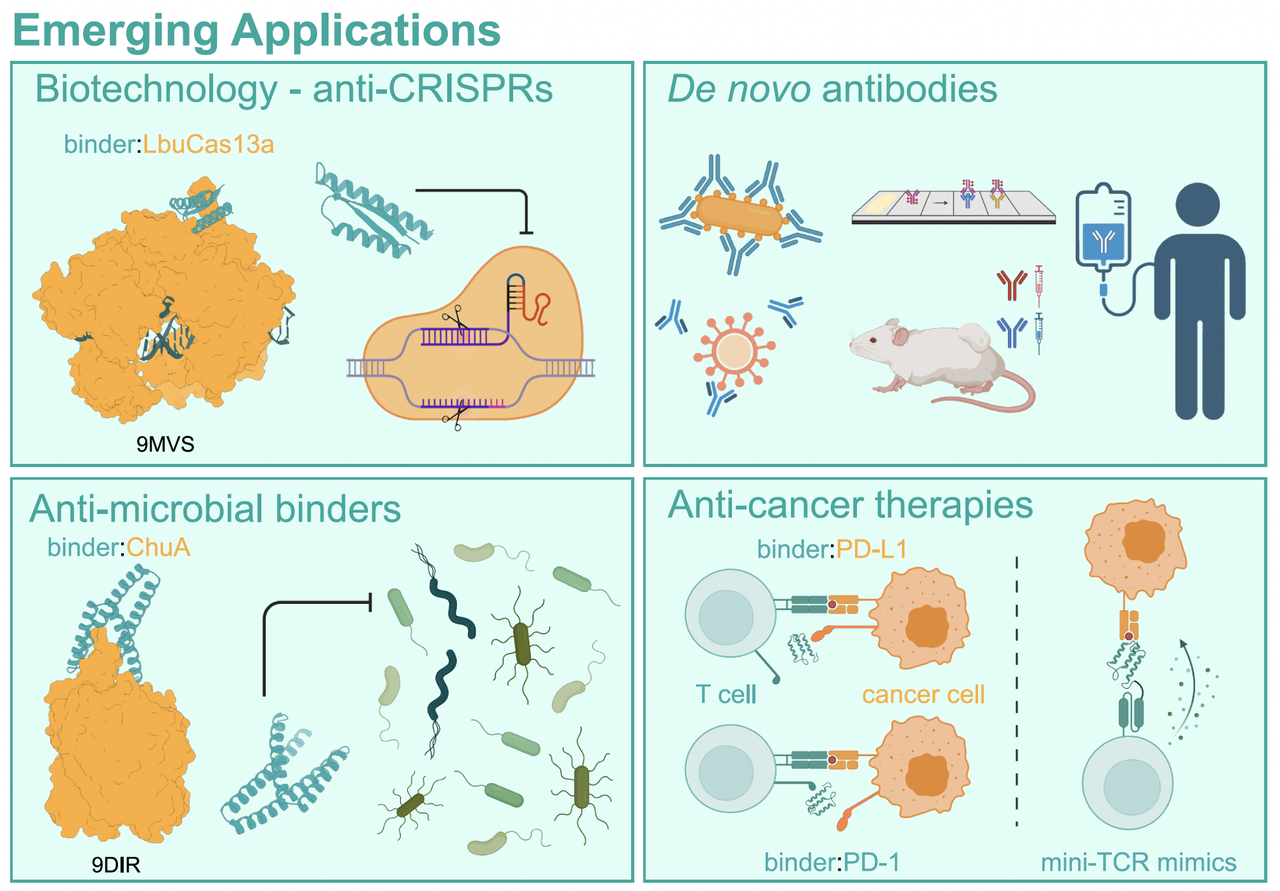如果说前面讲的工具和方法还比较抽象,那么文章中的 Figure 2 就让一切变得直观:它把 AI 设计出来的蛋白结合物(binders)的主要应用场景画成了一张全景图。我们可以从中看到,这些小小的人工蛋白,正在从实验室里走向实际的生物医学挑战。