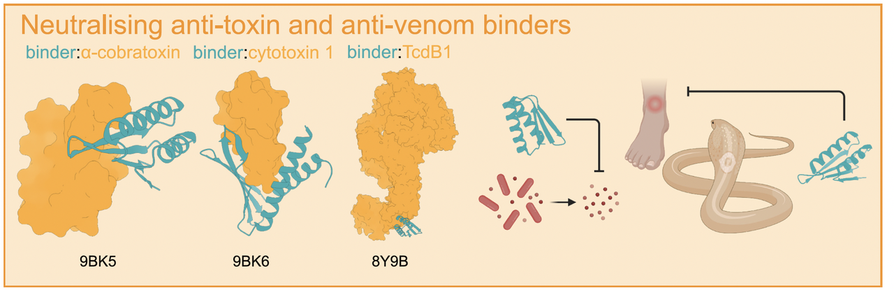 另一组研究者通过 MotifGraft + docking 的方法,设计出可以同时阻断毒素多个结合位点的迷你蛋白。最后甚至把两个 binder 融合成一个“双特异性小蛋白”,在小鼠肠道模型里表现出良好的保护作用。