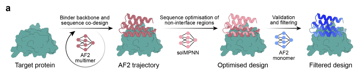 与 RFdiffusion 不同,BindCraft 在生成时会让靶点和设计的 binder 同时“共折叠”。