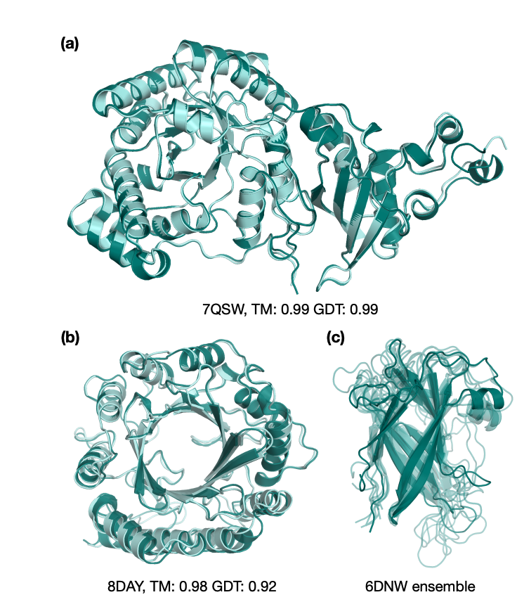 图中浅蓝色是实验结构,深蓝色是 SimpleFold 的预测,几乎完全重合(TM-score > 0.98)。