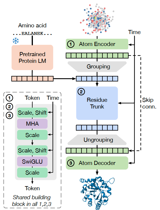 这意味着:SimpleFold 重新定义了蛋白质折叠问题,把它当成一个“条件生成任务”——从氨基酸序列出发,生成原子级别的三维结构。