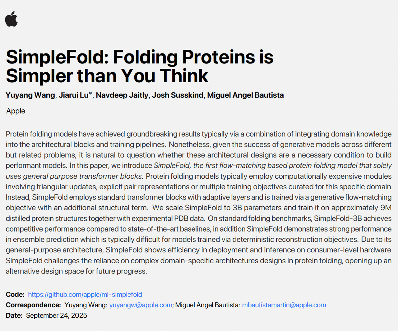 因此,SimpleFold 不仅是苹果在蛋白质设计领域的首次亮相,更可能代表一种新的范式:从复杂设计走向简洁通用,用数据和算力推动科学突破。