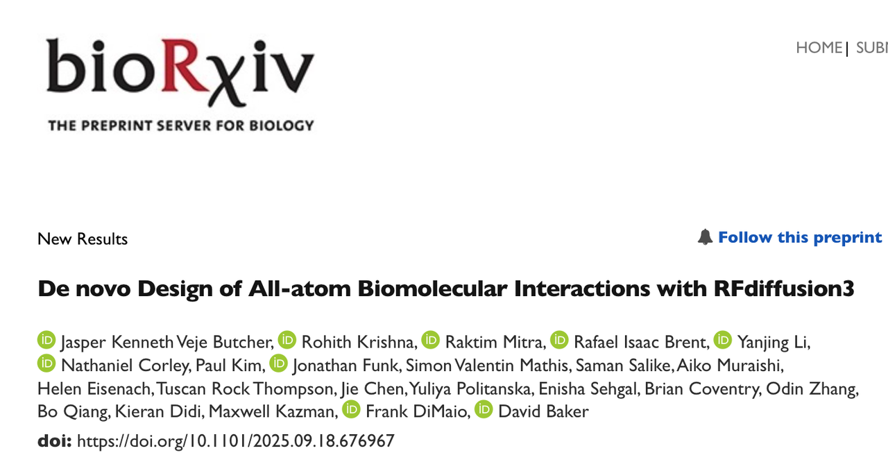 就在昨天(2025年9月18日),华盛顿大学 David Baker 团队在 bioRxiv 上发表了最新工作 《De novo Design of All-atom Biomolecular Interactions with RFdiffusion3》。在这篇文章中,研究人员提出了 RFdiffusion3(RFD3) ——一个全原子级的扩散模型,不仅能生成蛋白主链和侧链,还能同时处理小分子、DNA 等非蛋白分子。相比前代,它在计算效率上提升了一个数量级,同时在蛋白–蛋白、蛋白–DNA、蛋白–小分子结合以及酶设计等多类任务中全面超越了旧有方法。