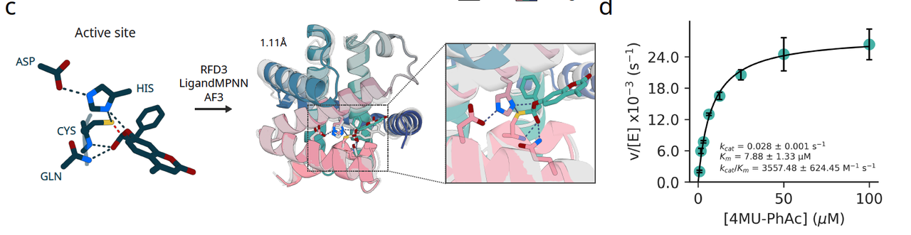 第二个测试是一个更具挑战性的任务:设计一类半胱氨酸水解酶,它需要经典的 Cys–His–Asp 催化三联体来完成底物水解。研究团队用 RFD3 根据最小的活性原子集合进行 scaffolding,随后在实验中检测设计的催化活性。