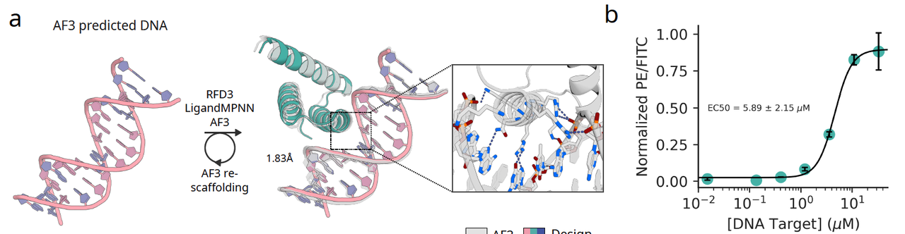 研究者首先用 RFD3 对一段随机生成的 DNA 序列进行设计。在第一轮生成后,他们选择了预测可靠的构象,再通过“重支架化”方法优化结合区,最终得到 5 个候选设计。将这些设计表达并检测结合活性后,结果发现其中有一个能稳定结合目标 DNA,且达到 低微摩尔级亲和力(EC50 ~ 5.9 μM)。