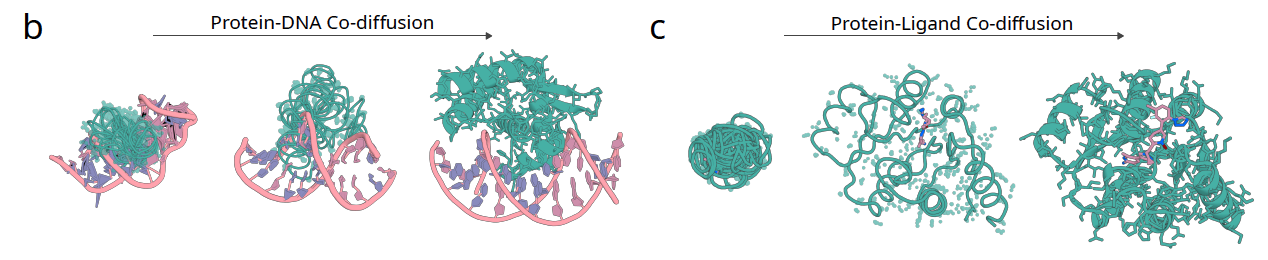 传统方法往往把 DNA 或小分子看作固定的外部对象,只设计蛋白部分。而在 RFD3 中,DNA 构象或小分子构象可以和蛋白一起被扩散生成。这样,结合界面不再是硬对接,而是动态适配,最终得到更加自然的相互作用模式。