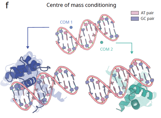 设计者甚至可以控制蛋白质整体相对于配体的空间位置。例如在 DNA 结合任务中,可以设定不同的蛋白质质心,模型会自动调整生成的构象来匹配。