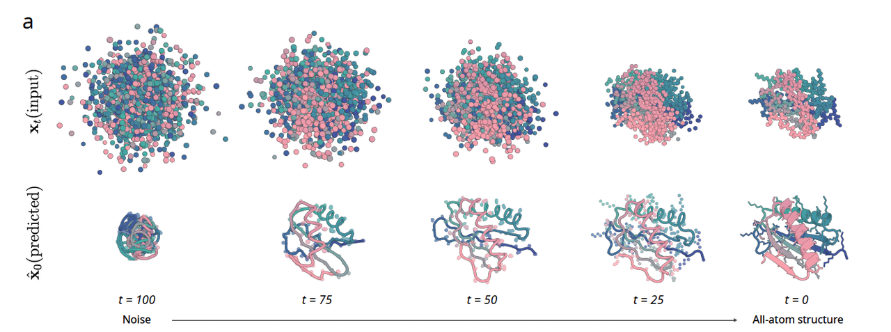这一部分展示了 RFD3 如何从完全噪声出发,逐步还原出有序的蛋白质结构。不同时间点的快照让人直观感受到:原子级扩散并不是“一下子生成”,而是一个不断消除噪声、逐渐逼近真实结构的过程。与前两代相比,这次不仅骨架在收敛,侧链的细节也在同步生成。