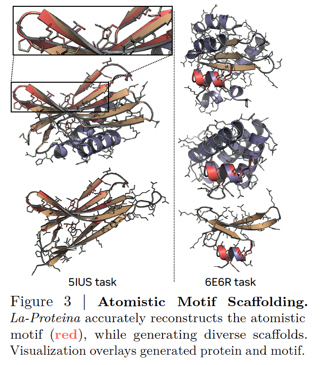 Figure 3 展示了 La-Proteina 在不同任务上的示例:红色部分是目标 motif,模型生成的 scaffold 能够把它嵌入在一个稳定、多样的蛋白框架中。