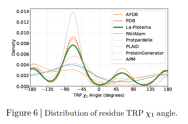 这说明 La-Proteina 的全原子生成结果并非“模糊平均”,而是真正捕捉到了蛋白质侧链的 构象能量面 与 生物物理规律。