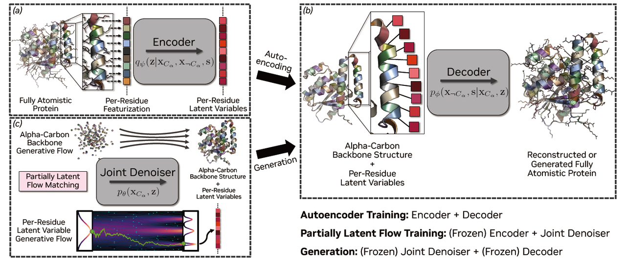 就在这种背景下,NVIDIA 团队提出了 La-Proteina —— 一种基于“部分潜变量 + 流匹配”的新型生成模型。它既能兼顾 backbone 的显式建模优势,又能高效处理侧链和序列细节,从而首次在 全原子蛋白生成 上实现了强大的可扩展性。