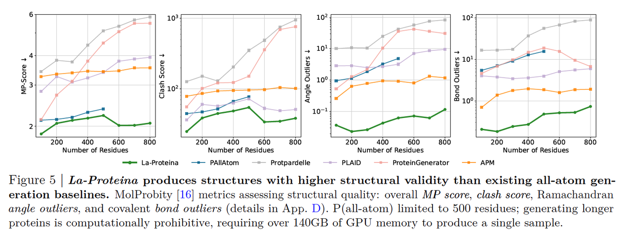 相比只做 backbone 的方法,La-Proteina 最大的突破在于:它不仅能生成骨架,还能同时生成 侧链与序列,而且可以扩展到 800 残基的长链蛋白。
