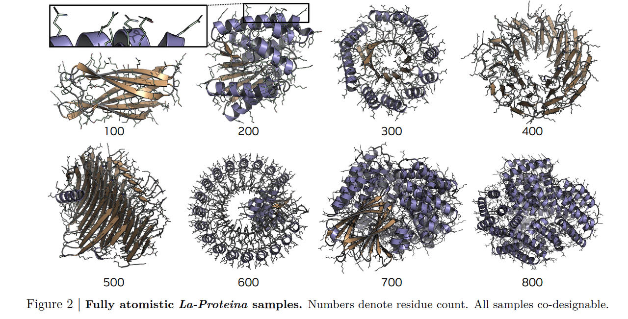 Figure 2 展示了 La-Proteina 直接生成的多个全原子蛋白样本(不同残基数)。