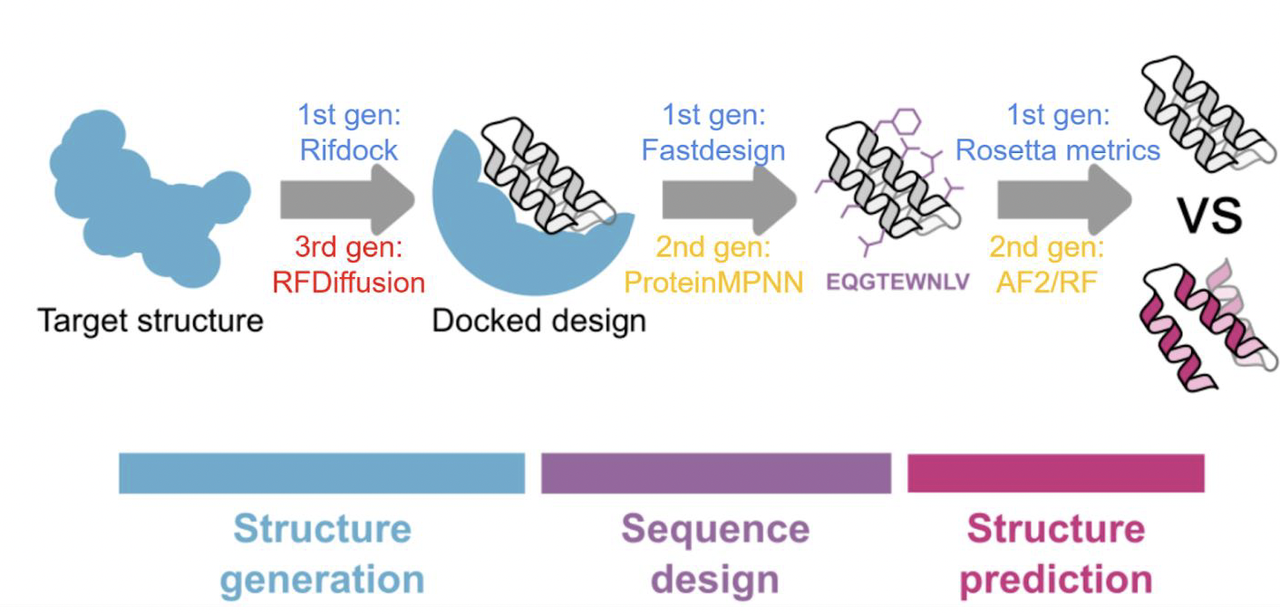 在第一代 Rosetta 流程中,虽然证明了 de novo 设计蛋白结合物是可行的,但极低的成功率和高昂的成本严重限制了应用。为此,研究者在第二代 pipeline 中引入了 深度学习工具,大幅提升了效率和准确性。