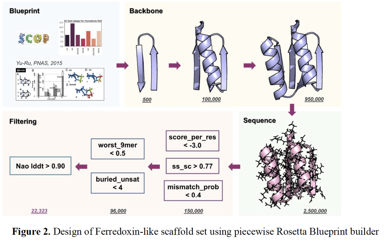 然后通过 Rosetta Blueprint 构建方法,组合不同的 α 螺旋、β 片层和环区,拼装成几十个氨基酸长的小蛋白骨架。