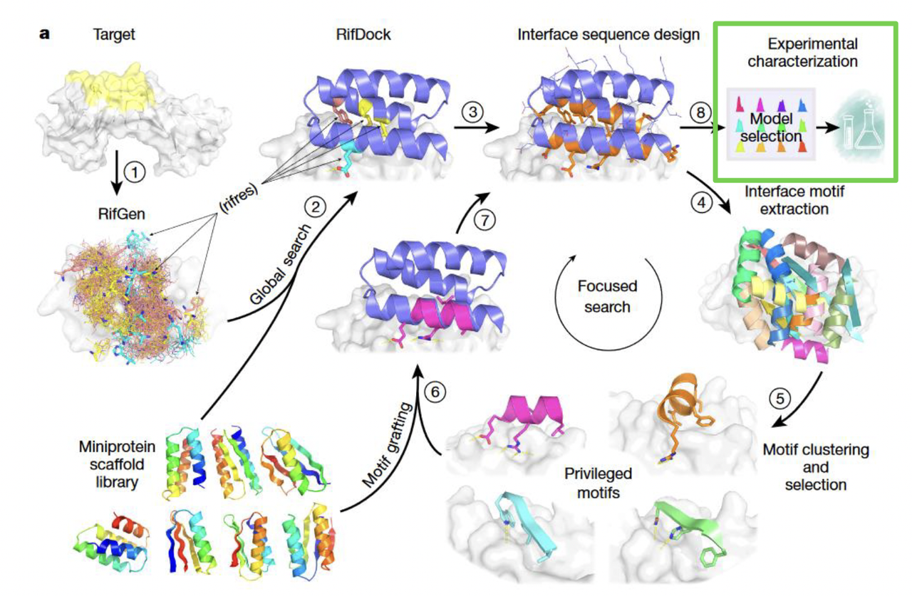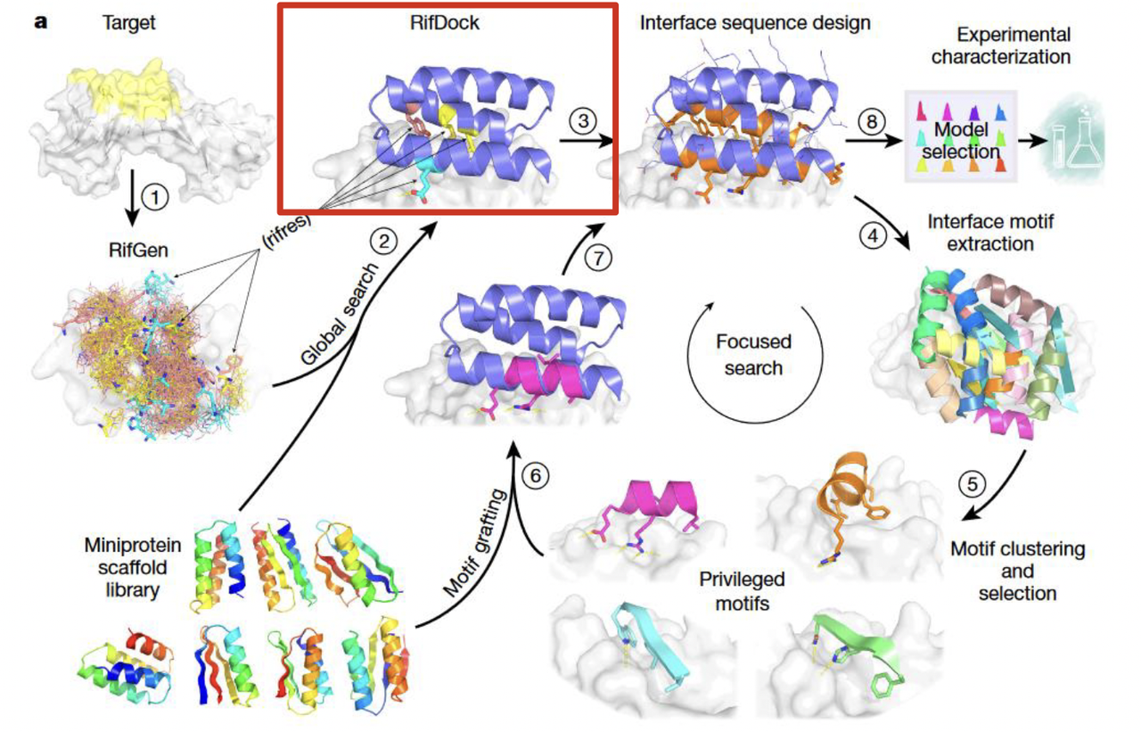 接下来,研究者使用 PatchDock 和 RifDock 这两种分子对接工具,把骨架尝试性地“放置”到目标蛋白的结合表位上。