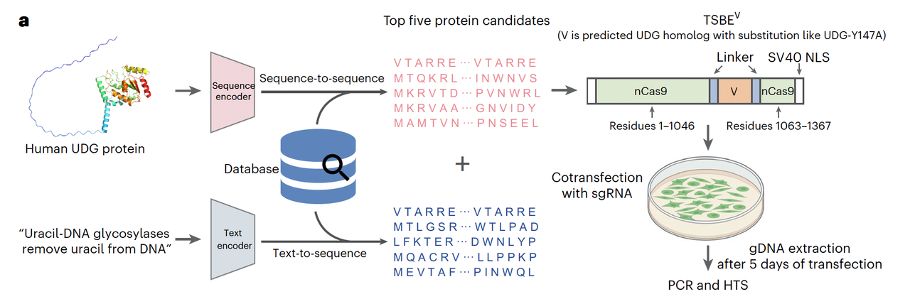 ProTrek 的强大不只体现在数据上的指标,更在于它能启发新的实验发现。研究团队选择了一个非常具体、也非常有挑战性的目标:寻找与人源 UDG(Uracil DNA Glycosylase)功能相似的蛋白。UDG 是一种经典的碱基修复酶,能够从 DNA 中切除尿嘧啶。近几年,科研界基于它开发出一类新的碱基编辑系统——TBE(Thymine Base Editor)。然而,这些系统普遍存在编辑效率低的问题,核心瓶颈正是人源 UDG 变体的活性不足。