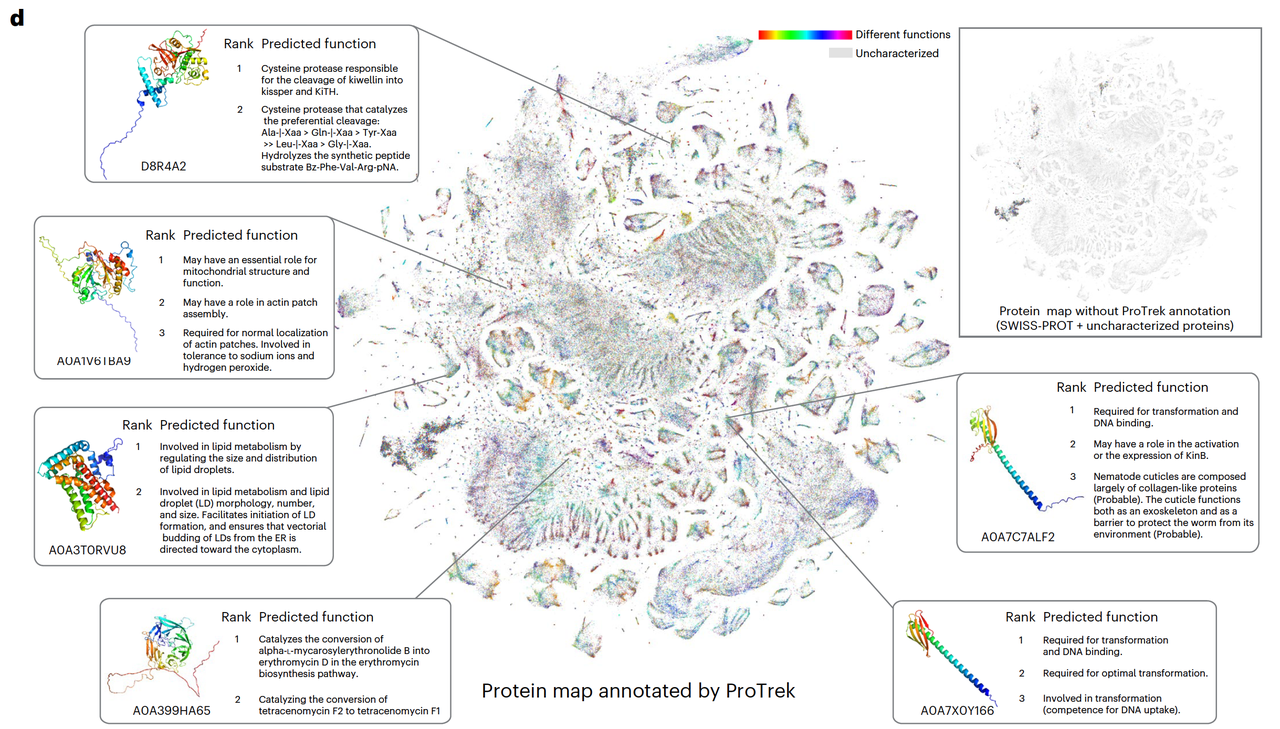 更有意思的是,图1d展示的结果让人第一次看到一个“语言化的蛋白宇宙”。在经过三模态对齐后,ProTrek 能够根据功能而非序列,将不同蛋白聚类到同一个语义空间中。图中那些颜色分布的点簇,并不是传统意义上的同源家族,而是被模型判定为“功能相似”的分子。换句话说,ProTrek 已经学会了用“语义”来组织蛋白世界。