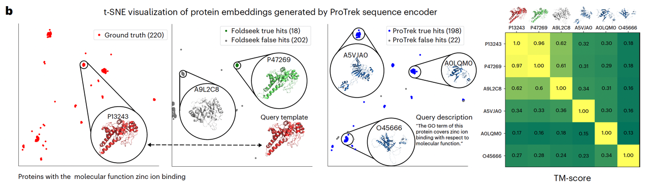 图2b中的案例几乎是对这一能力的直接证明。研究者以“zinc ion binding”这一功能描述作为检索输入。对于传统的结构比对工具 Foldseek,找到的结果里只有 18 个是真实具备锌离子结合功能的蛋白;而 ProTrek 的检索结果中,198 个是真实的命中。更令人印象深刻的是,当这些结果被投射到结构相似性空间中时,可以看到:许多具备相同功能的蛋白在结构上几乎毫不相似。换句话说,ProTrek 能够透过结构形式,捕捉到功能的语义。