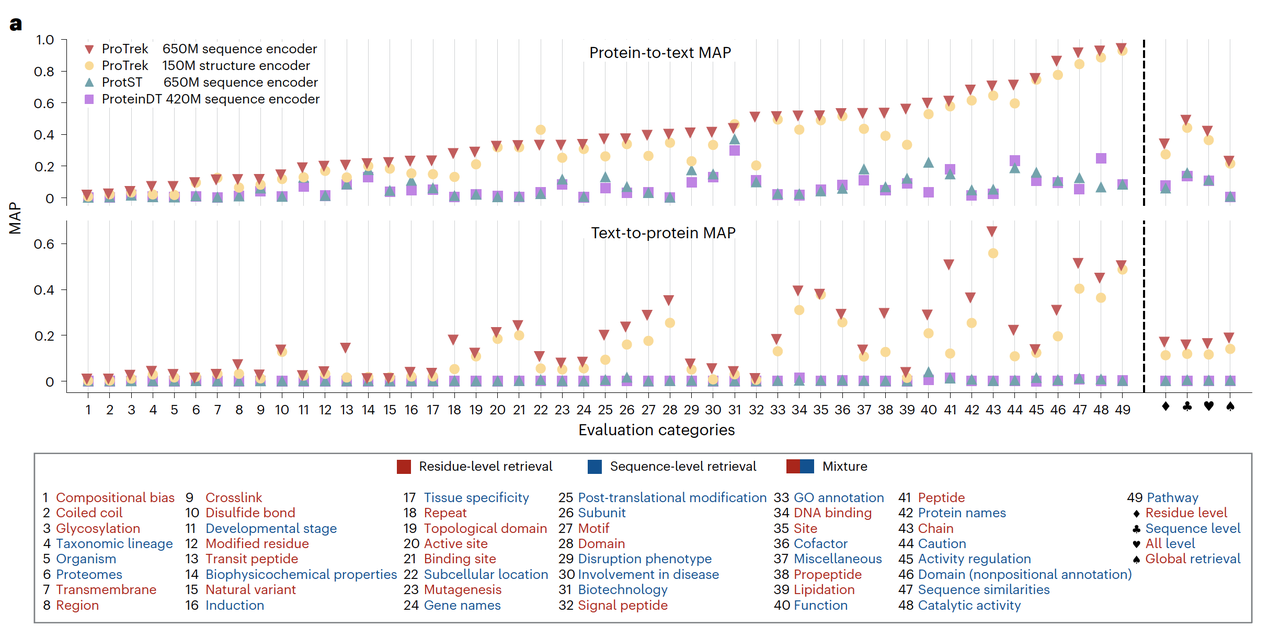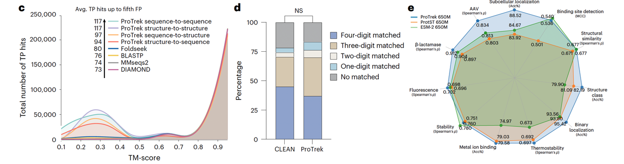 这类结果说明了一个关键变化:模型已经不再依赖进化或物理相似性去推断功能,而是从数据中学习到了一种更抽象的“生物学语言”。图2c 的性能对比进一步支持了这一点。在不同模态的搜索任务中,无论是序列对序列还是结构对结构,ProTrek 都显著超越了 MMseqs2、DIAMOND 和 Foldseek,尤其是在那些低 TM-score 的区域,它依然能正确地识别出功能相近的蛋白。这种能力意味着它不只是“更快的搜索工具”,而是开始具备了功能层面的泛化理解。