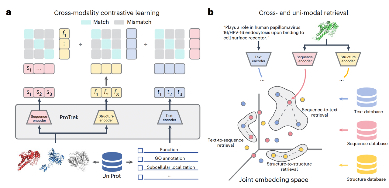 这种“理解”的基础在于对比学习(contrastive learning)。模型在训练时被迫去判断哪一对数据是正确对应的,哪一对是无关的。具体而言,它会同时接收三种信息:一个蛋白的序列、它的结构,以及它在数据库中对应的功能文本。ProTrek 学会通过嵌入(embedding)把它们投射到同一个空间中,让真正属于同一个蛋白的三模态样本距离更近,而随机配对的样本被推得更远。经过大规模训练后,模型便形成了一个“通用语义地图”,能自动捕捉蛋白之间深层次的结构与功能关联。