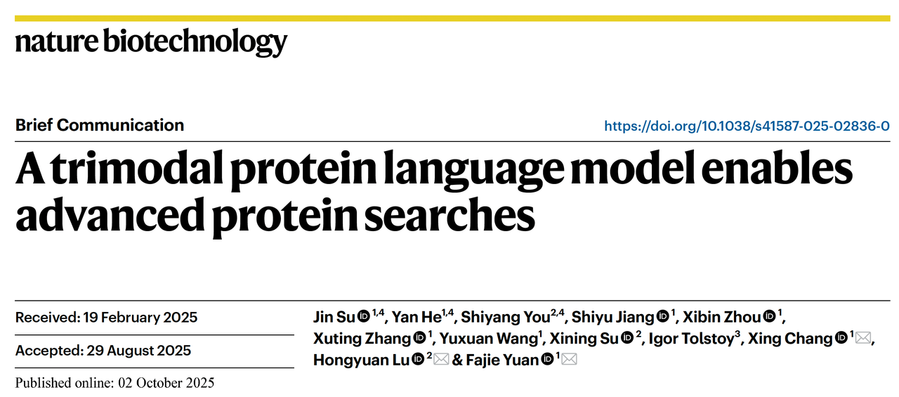 这正是西湖大学原发杰团队提出的问题。原老师在最新发表在《Nature Biotechnology》上的文章《A trimodal protein language model enables advanced protein searches》中,并没有把蛋白质看作一串序列,而是看作一个能“说三种语言”的存在:氨基酸的语言、折叠结构的语言,以及自然语言中的功能描述。他们提出的模型——ProTrek,尝试让这三种语言在同一个语义空间里互相对齐。
