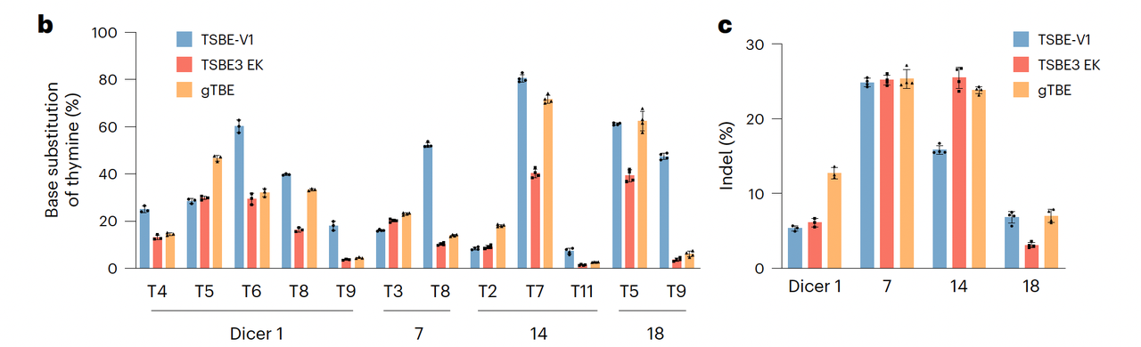 实验验证的结果印证了 ProTrek 的判断。几乎所有候选蛋白在细胞实验中都表现出不同程度的胸腺嘧啶编辑活性,而其中排名第一的变体——V1,编辑效率在多个位点上明显超过了现有的 TSBE3 EK 和 gTBE 系统,并且伴随更低的插入缺失(indel)比例。换句话说,ProTrek 不仅找到了功能相似的蛋白,还帮助研究者设计出一个性能更好的编辑工具。
