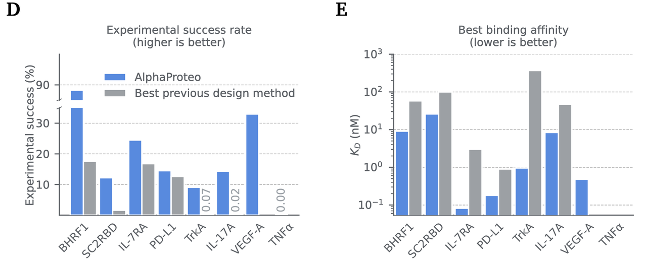 这说明 AlphaProteo 的设计不仅“能结合”,而且“只结合它该结合的对象”。对于药物开发来说,这一点至关重要,因为非特异性结合往往意味着副作用。