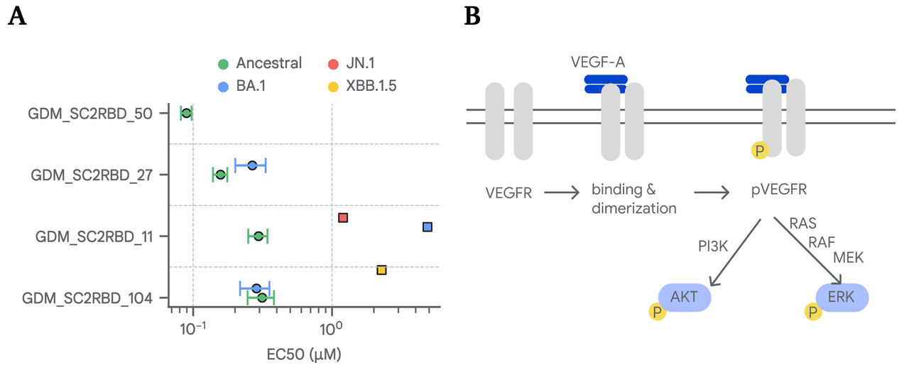 特别值得一提的是:AlphaProteo 是第一个在 VEGF-A 上成功设计出结合物的方法。