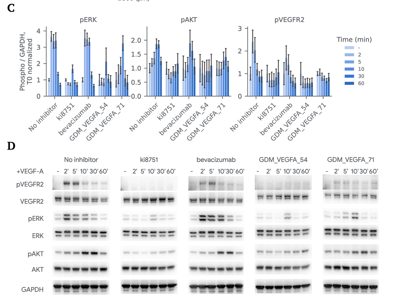 在 Figure 4B-D 的细胞实验中,设计的结合物(如 GDM_VEGFA_54)显著降低了 VEGFR2 及下游 ERK、AKT 的磷酸化水平。