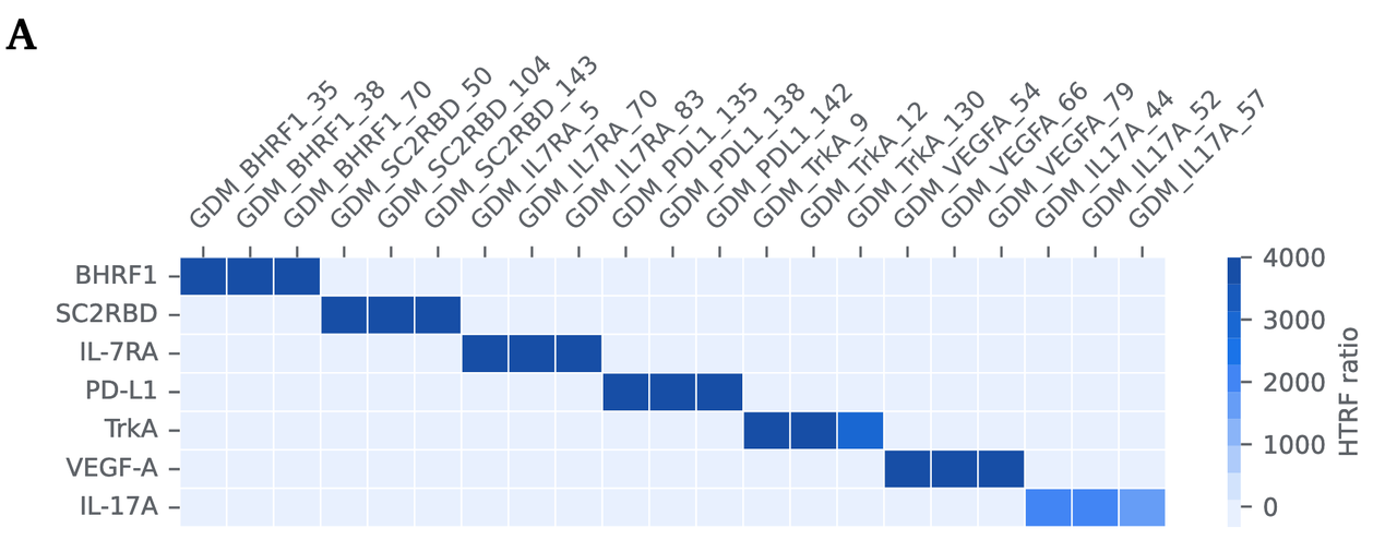 在 Figure 3A 的实验中,研究人员把设计好的结合物拿去测试,看它们是否会和其他靶点也发生结合。