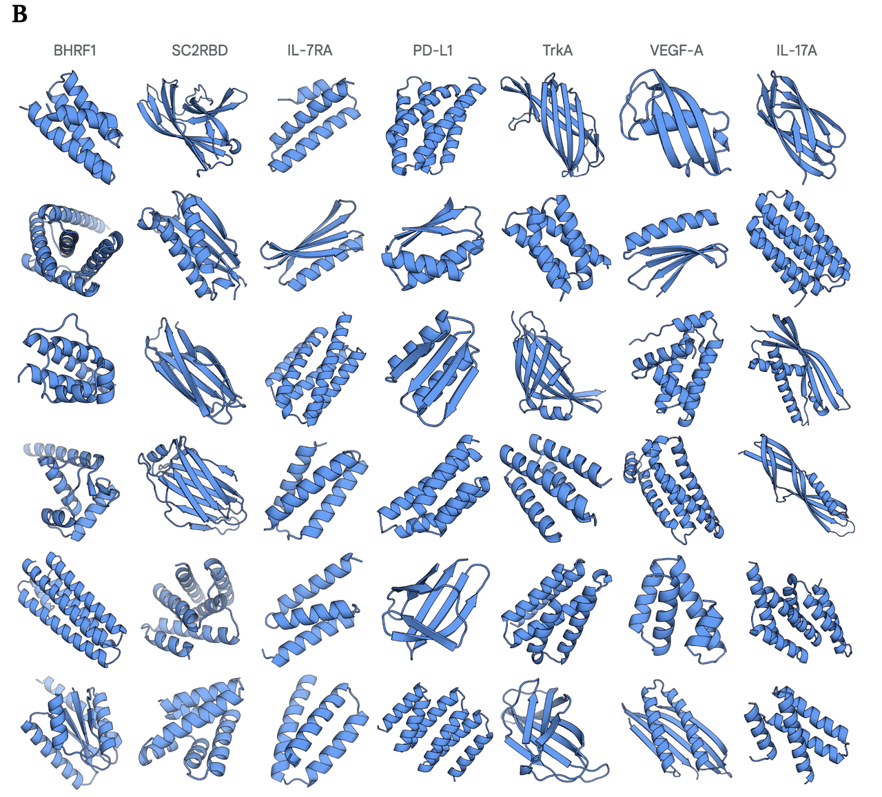 在实验验证环节,DeepMind 团队选择了 8 个不同的蛋白靶点,涵盖了从病毒蛋白(比如 SARS-CoV-2 的 RBD)到临床相关的人类蛋白(比如 PD-L1、VEGF-A),难度层次各不相同。