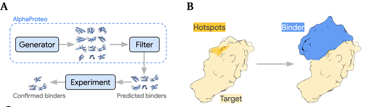 在论文的 Figure 1A和B 里,团队用一个直观的示意图展示了 AlphaProteo 的工作方式: