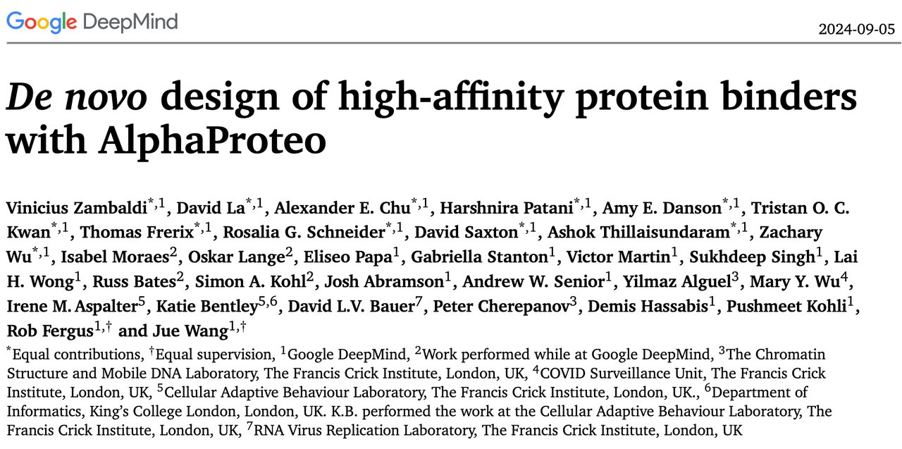 他们在去年的技术报告中推出了 AlphaProteo ——一个专门面向 高亲和力蛋白结合物设计 的系统。论文题目是《De novo design of high-affinity protein binders with AlphaProteo》,由 Google DeepMind 与 Francis Crick 研究所等合作完成。