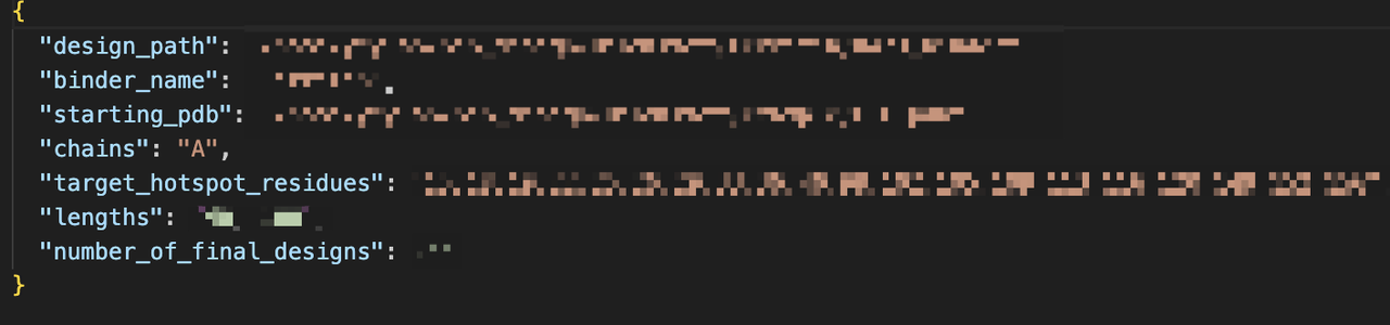 用户以 JSON 格式提供目标蛋白(PDB格式)、binder长度范围、目标设计数量等;