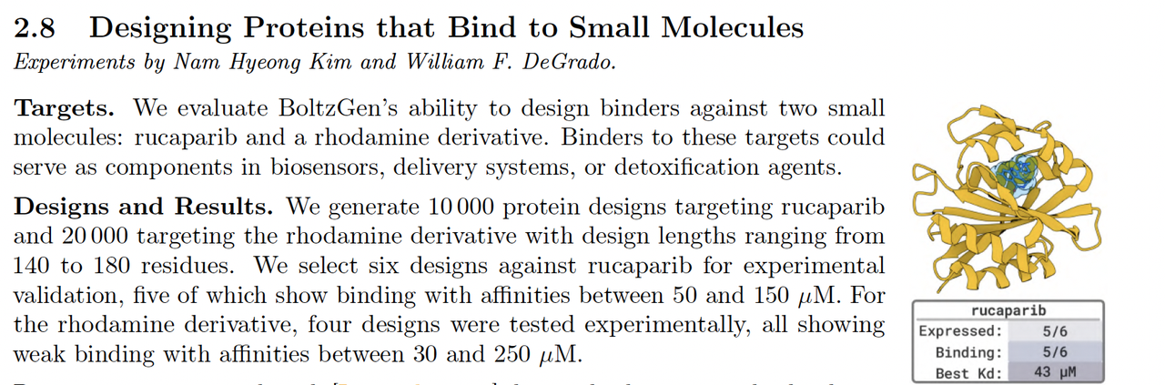 这说明 BoltzGen 已具备跨模态建模能力,能够在同一网络中处理蛋白–小分子、蛋白–肽等不同层次的相互作用。