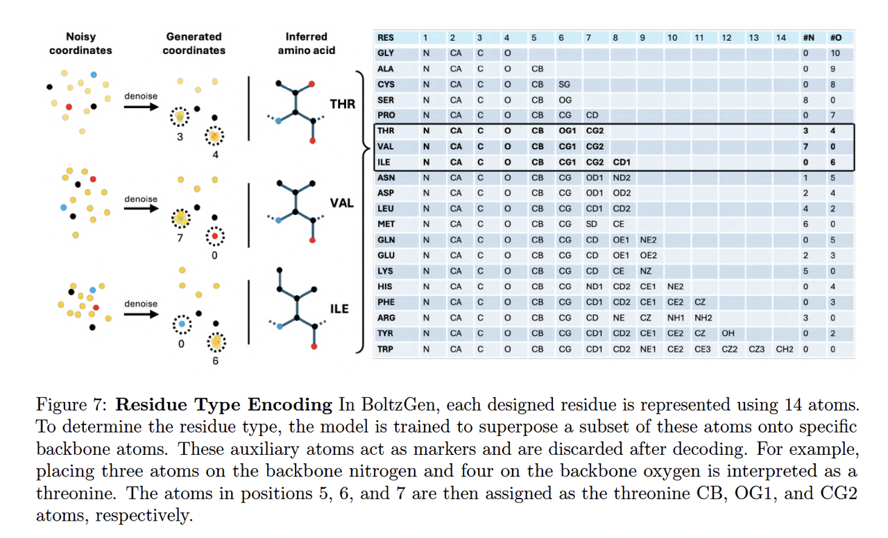 与传统的分子生成模型(如仅在残基层面建模)不同,BoltzGen 的每个采样变量都是具体原子的位置向量。模型通过能量一致性约束(energy consistency)学习键长、键角、二面角等局部几何关系,从而在生成时自动保持化学合理性。这里对于全原子建模采用了Atom14的方法,也是之前讲过的文章Pallatom中提到的。