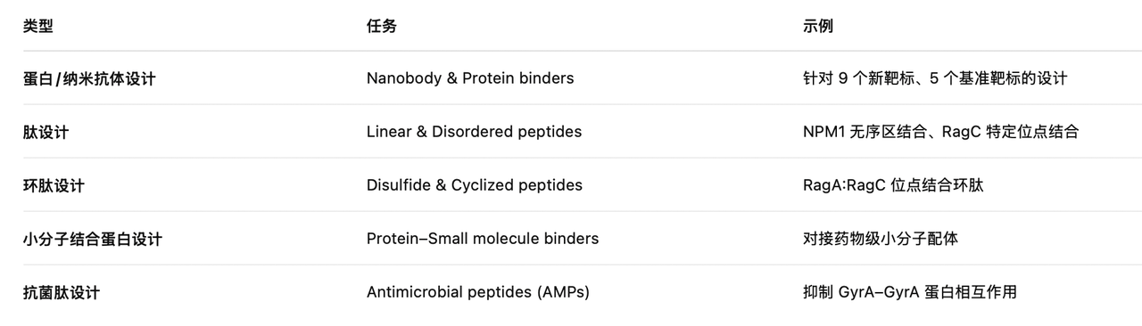 作者在论文第二章中总结了十类实验任务,涵盖 蛋白质、肽类、环肽、小分子结合体及抗菌肽设计 等多种体系,