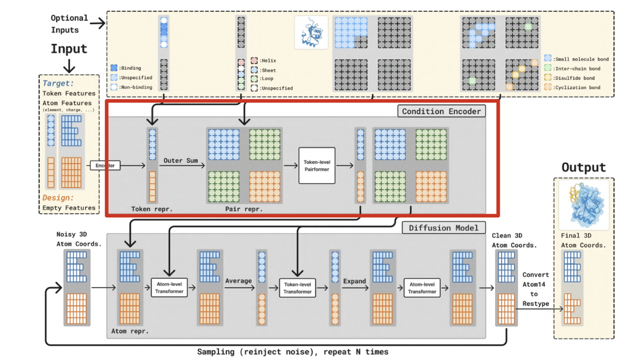 Condition Encoder 是 BoltzGen 的核心。它将目标与设计的原子特征映射为统一的几何表征,通过 token-level 与 pair-level transformer 捕捉分子间空间关系。