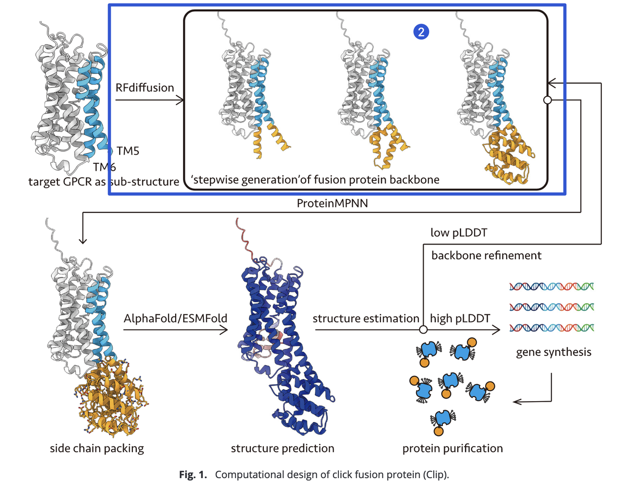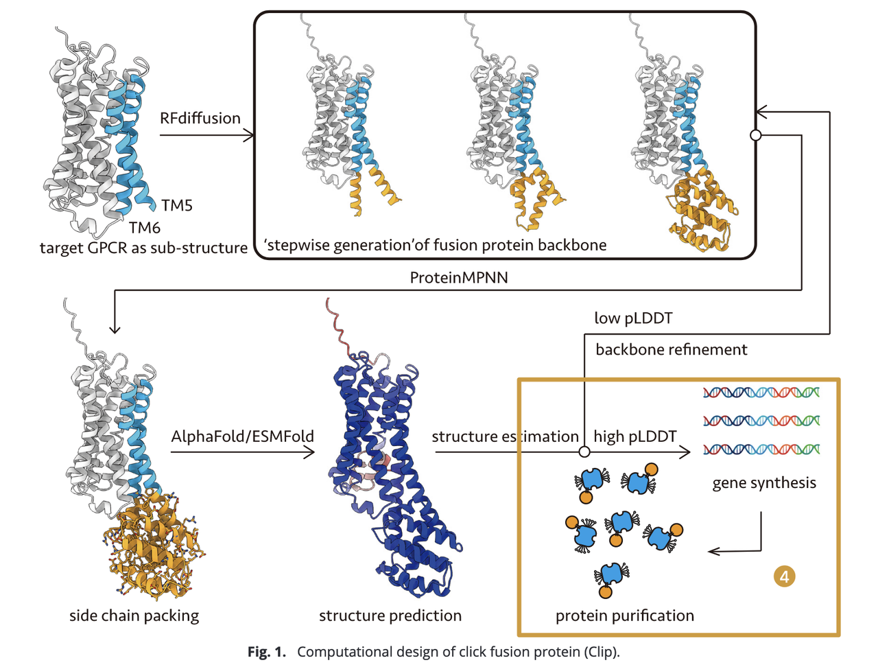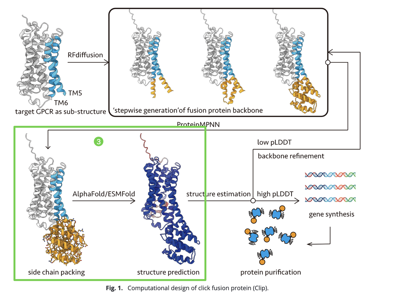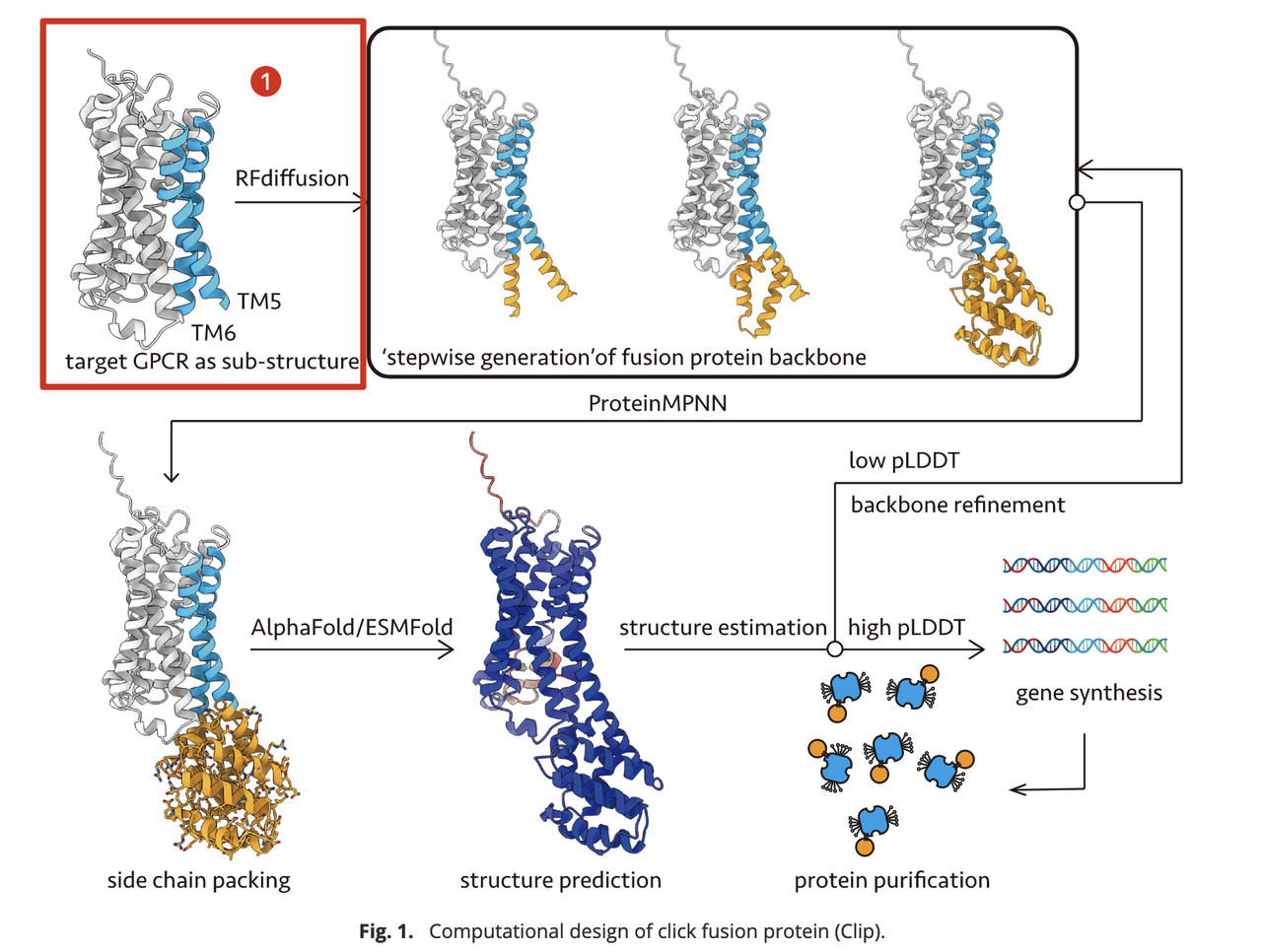 - 选择高 pLDDT 分数的设计方案合成编码 DNA,并在细胞中表达、纯化以获得 GPCR-Clip 蛋白,进入后续生化与结构验证环节。