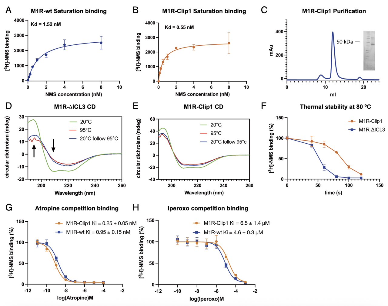 放射性配体饱和结合实验([³H]-NMS)显示,M1R-Clip1 与野生型 M1R 的解离常数(Kd)相近(0.55 nM vs. 1.52 nM),说明融合不影响受体与拮抗剂的亲和力。