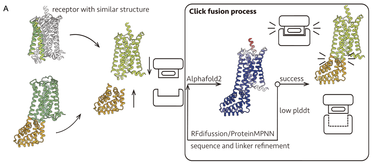 Click Fusion 的命名有两层含义:一是整个设计流程主要通过计算实现,相比传统方法大幅减少实验迭代,仅需“点击”鼠标即可完成大部分工程;二是 Clip 蛋白与 GPCR 的 TM5/TM6 区域在结构上高度匹配,像“卡扣”一样稳固结合。
