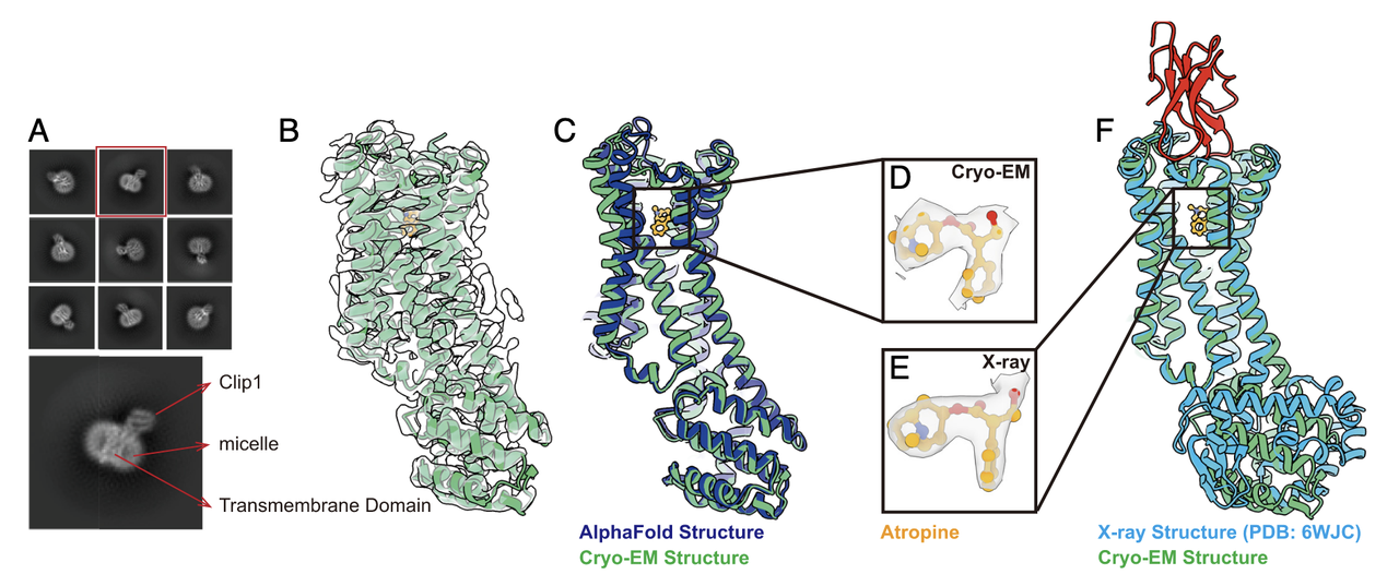 在跨膜螺旋顶部观察到一团未解释的密度,形态类似 atropine,但尚不能确定其来源,有待进一步研究。