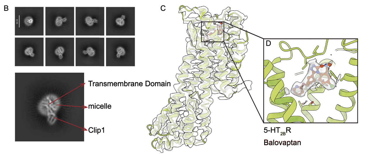 利用 5-HT₂BR-Clip1 与拮抗剂 Balovaptan 复合物进行 cryo-EM 数据采集,最终获得分辨率 3.6 Å 的结构。