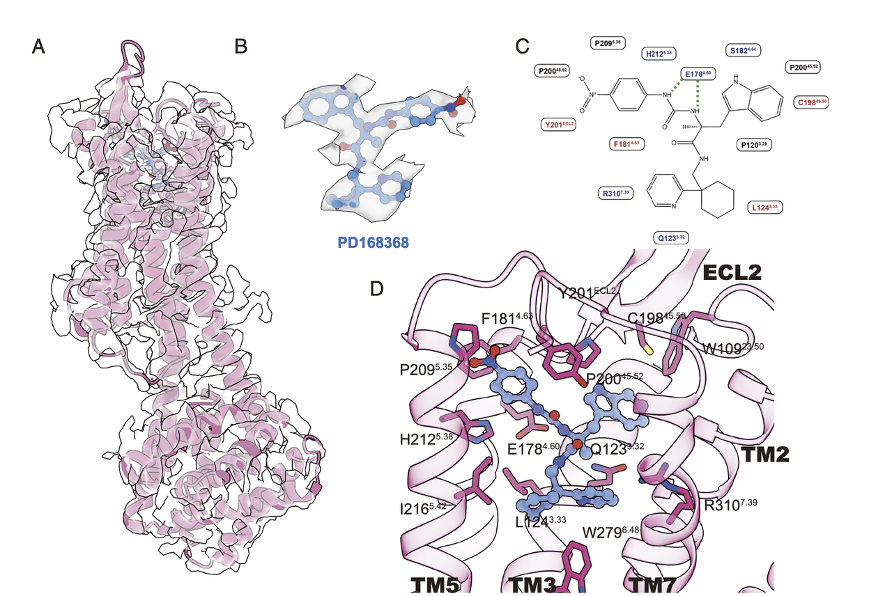 PD168368 占据了正构结合口袋的下部,阻断了激活所需的关键构象变化。